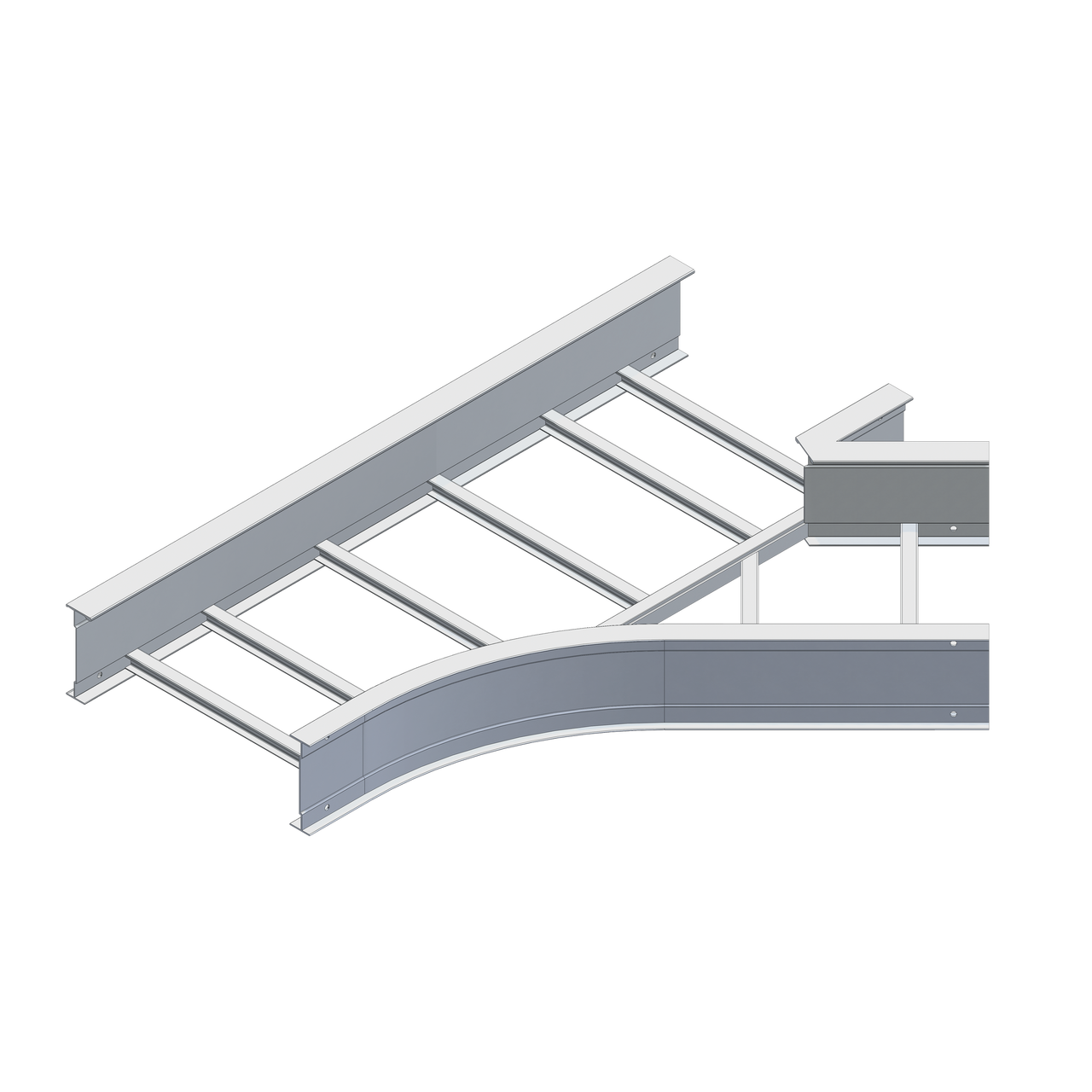 Wye fittings join cable trays in three directions. Rail heights range from 4'' to 7'' and widths range from 6'' to 36''. Wye fittings are available with a 24'' radius. Tray types are available in ladder and solid bottom.