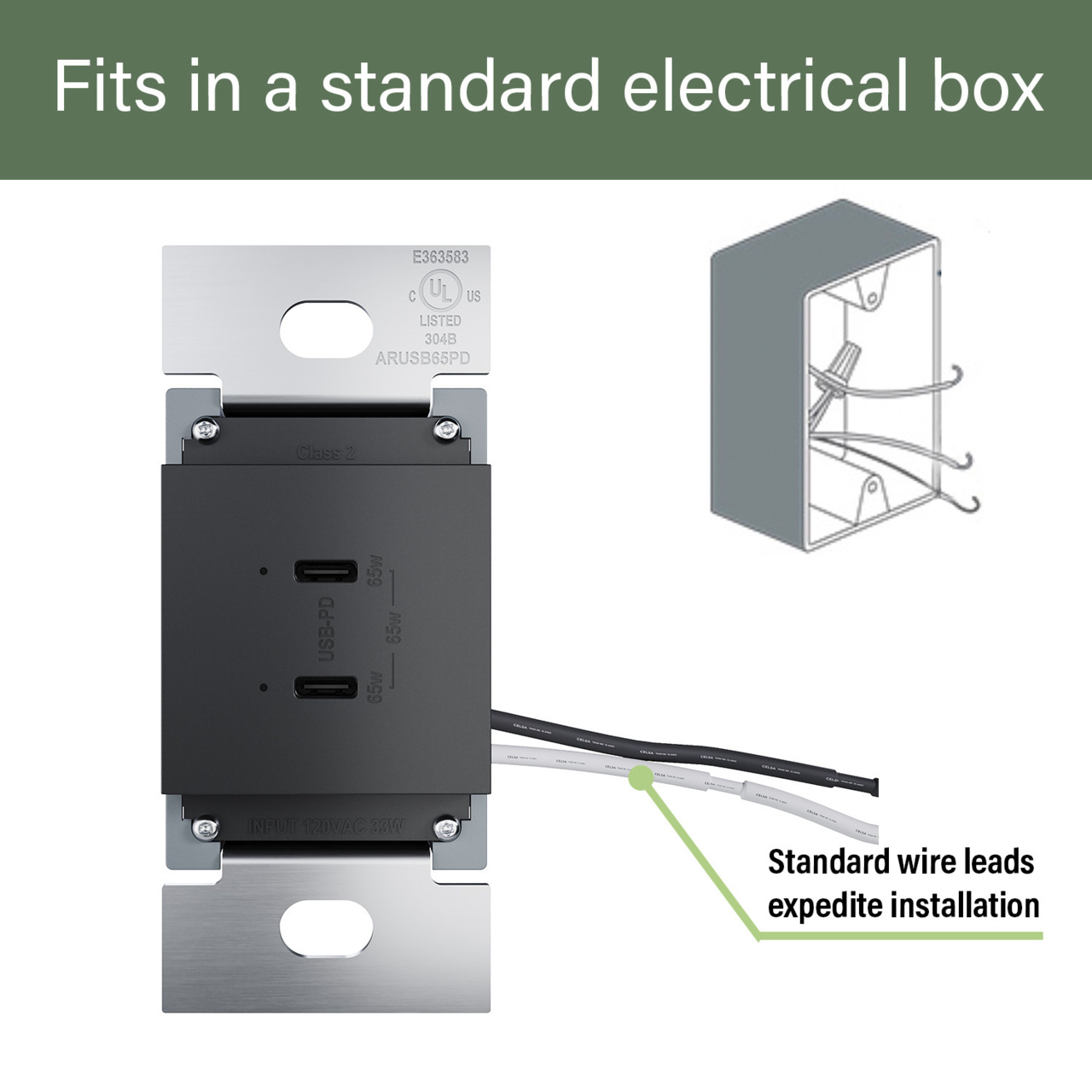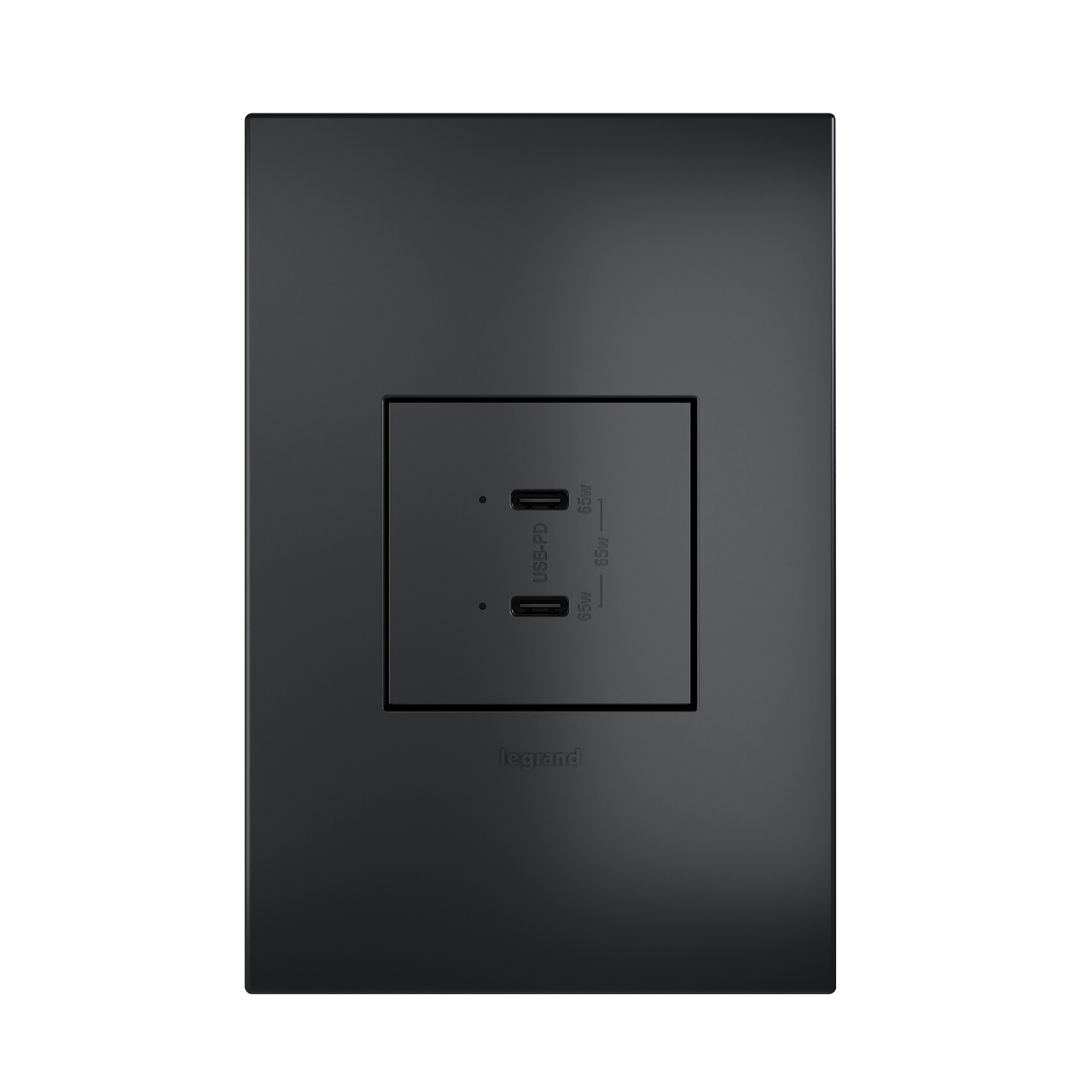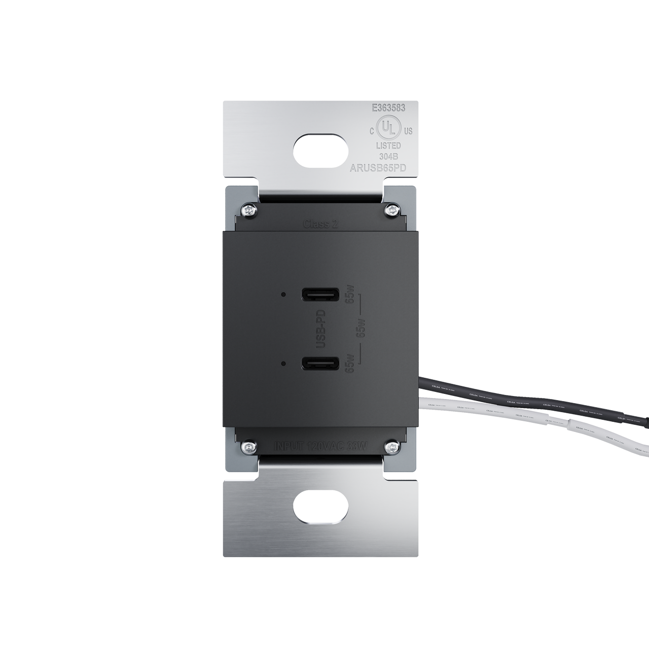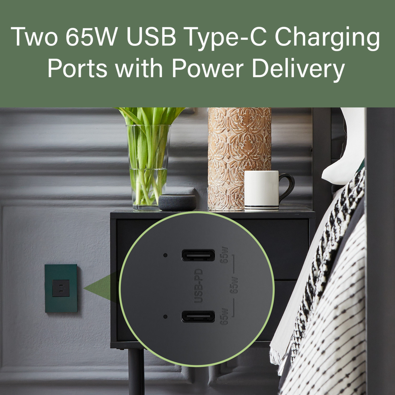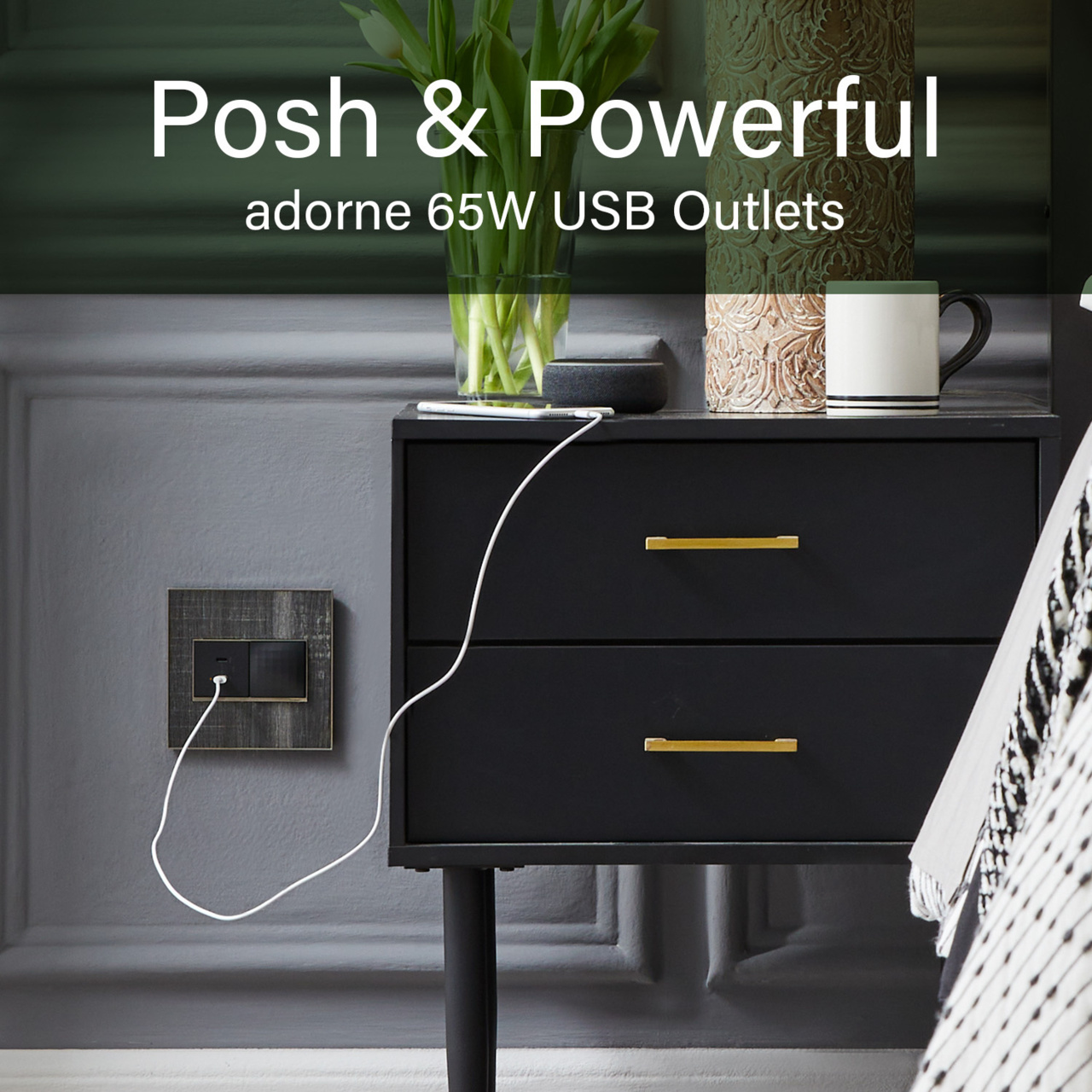 Featuring two USB Type-C ports with industry-leading 65W of power each, this device provides the fastest USB charging for phones, tablets and laptops. Advanced Power Delivery provides intelligent charging that negotiates optimal voltage and current between the outlet and the device being charged. Easily replaces a traditional outlet in as little as ten minutes. Enjoy USB charging functionality in every room of your home with the unique adorne contemporary aesthetic. Made exclusively for use with screwless wall plates from the adorne® Collection, sold separately.
