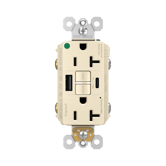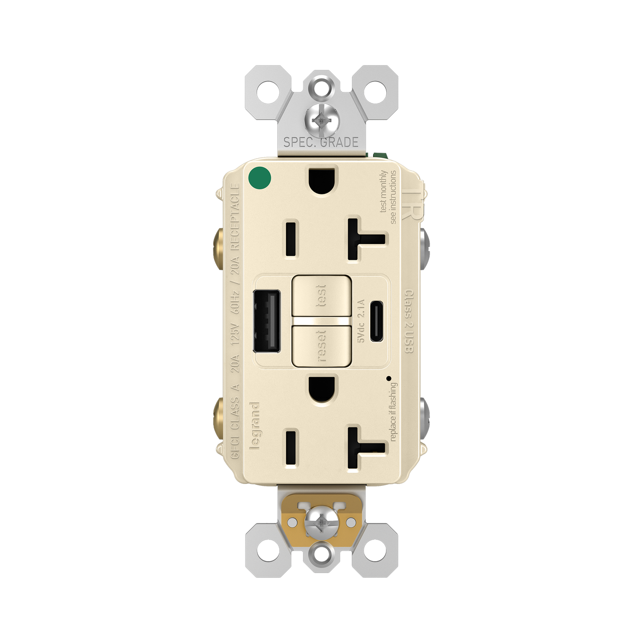 radiant® Hospital Grade GFCI USB Outlet with SafeLock® Protection, Type A/C, 20A, Tamper-Resistant, Light Almond