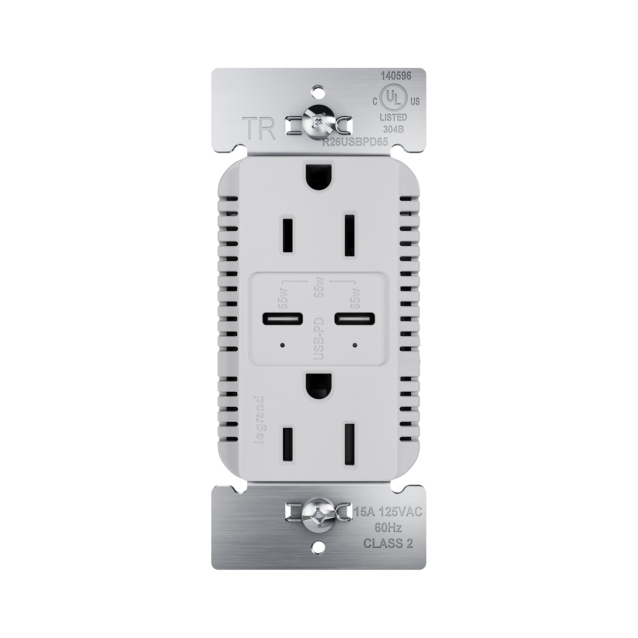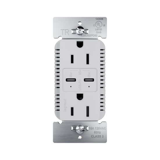 Charge the latest smartphones, tablets and small laptops with the 65W USB Outlet featuring dual Type-C USB ports with Power Delivery. The result is a fast, long-lasting outlet for convenient in-wall charging, specially designed to safely and efficiently charge your devices. Easily replace a traditional outlet in as little as ten minutes to gain the modern functionality of intelligent charging for maximized speeds, complete with multi-layered overcurrent protection to keep the outlet and your devices safe from damage. An industry-exclusive charging indicator light tells you when your device is charging and when it's fully charged, for life on the go. Made exclusively for use with screwless Wall Plates from the radiant® Collection, sold separately.
