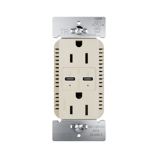 Charge the latest smartphones, tablets and small laptops with the 65W USB Outlet featuring dual Type-C USB ports with Power Delivery. The result is a fast, long-lasting outlet for convenient in-wall charging, specially designed to safely and efficiently charge your devices. Easily replace a traditional outlet in as little as ten minutes to gain the modern functionality of intelligent charging for maximized speeds, complete with multi-layered overcurrent protection to keep the outlet and your devices safe from damage. An industry-exclusive charging indicator light tells you when your device is charging and when it's fully charged, for life on the go. Made exclusively for use with screwless Wall Plates from the radiant® Collection, sold separately.