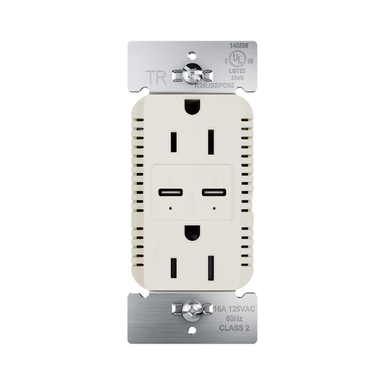 Charge the latest smartphones, tablets and small laptops with the 65W USB Outlet featuring dual Type-C USB ports with Power Delivery. The result is a fast, long-lasting outlet for convenient in-wall charging, specially designed to safely and efficiently charge your devices. Easily replace a traditional outlet in as little as ten minutes to gain the modern functionality of intelligent charging for maximized speeds, complete with multi-layered overcurrent protection to keep the outlet and your devices safe from damage. An industry-exclusive charging indicator light tells you when your device is charging and when it's fully charged, for life on the go. Made exclusively for use with screwless Wall Plates from the radiant® Collection, sold separately.